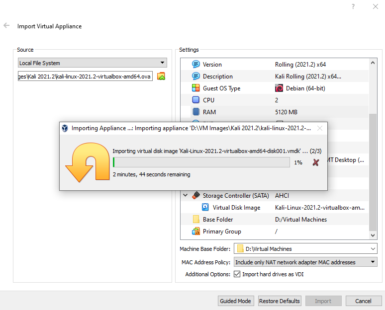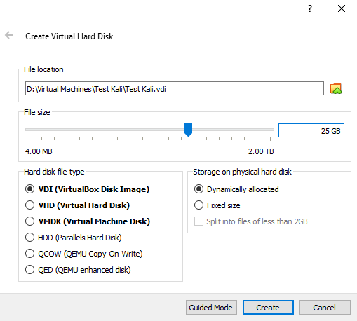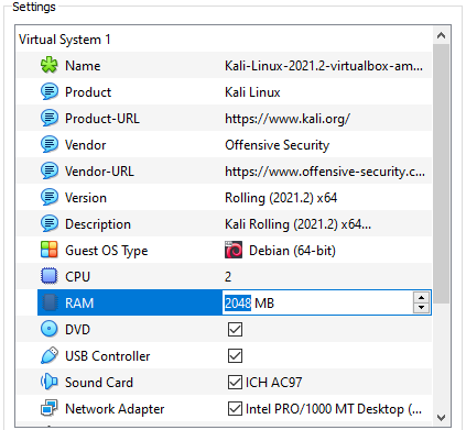 Most Kali images have around 80GB of disk space assigned, which should be more than enough for most people - this space won’t be consumed on your drive immediately, it is simply an upper limit of the size of the VM.
