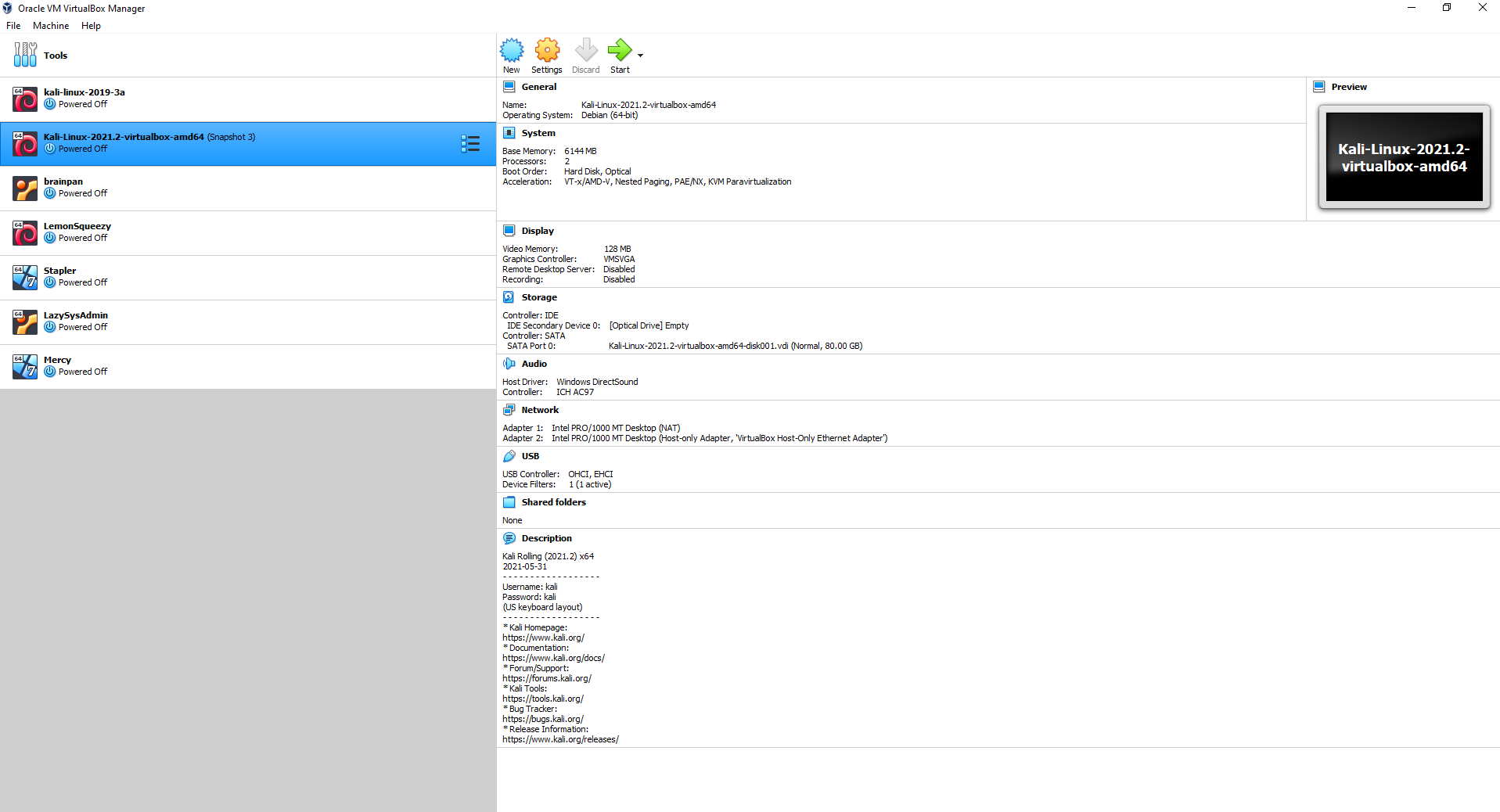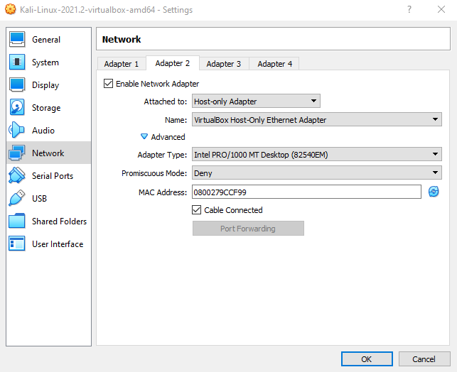 This section is not necessary for a basic VM setup, but will be useful if you intend to connect two VMs together. You might, for example, want to have a Kali VM and a vulnerable Virtual Machine from VulnHub to attack.