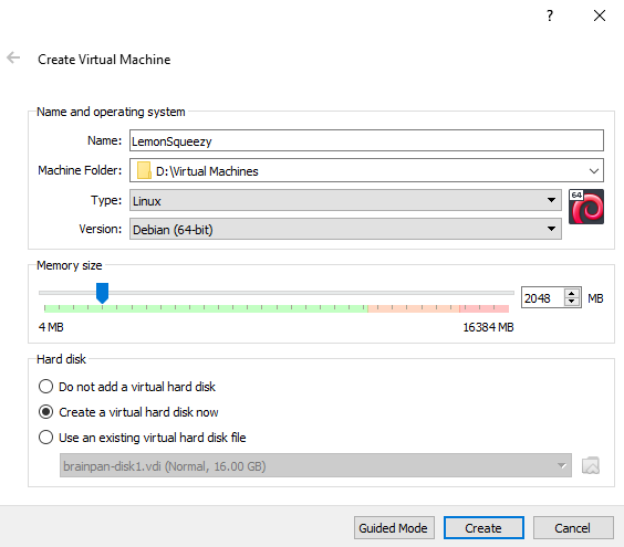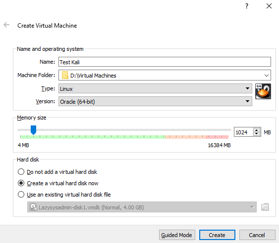 To import a downloaded Kali disk image (.iso file), hit Ctrl + N to create a new machine, select the Linux Operating system, and give it whatever specifications you want, but select the Create a virtual hard disk now option: