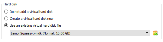 In the bottom, select Use an existing virtual hard disk file and click the folder icon to select the .vmdk file for the machine you’re importing - if it’s not in the list, click Add to import it: