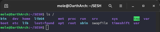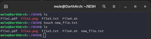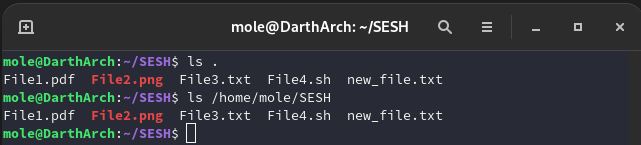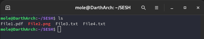 First we want to be able to see what files we have access to, the ls command allows us to see the files in our current working directory. In the following example I will be in the ~/SESH directory. I will explain this a bit later.