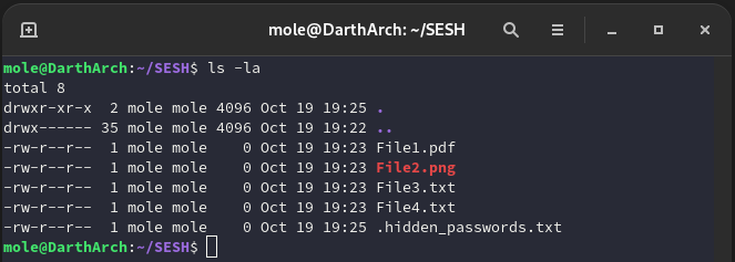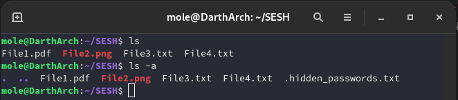 As you can see we can see some of the files in this directory, but this isn’t all of the files. By default, ls doesn’t show all hidden files. To show all files AND hidden files we can use the -a flag.