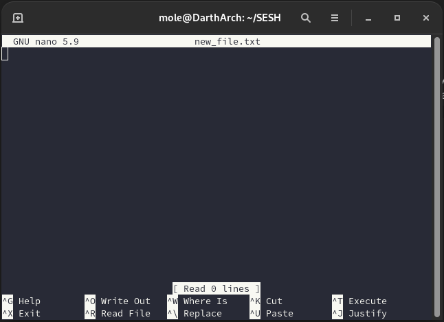 To edit this file, we can use a terminal text editor called nano, it is possibly the easiest text editor to use in Linux. It allows us to insert, copy, paste, delete along with a load of other functions. To edit the file we just created, we will type nano new_file.txt (If the file hasn’t already been made, then saving the file will create the file).