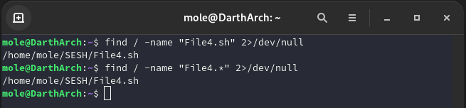 For example, find / -name "File4.sh" would find all files where the name of the file contains passwd. This will, however, output some permission denied errors. To mute the permission denied errors, we can put 2>/dev/null on the end of the command. This simply tells the errors (using file descriptor 2 which is standard error) to redirect to /dev/null (Unix equivalent to the void).