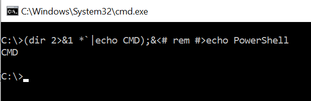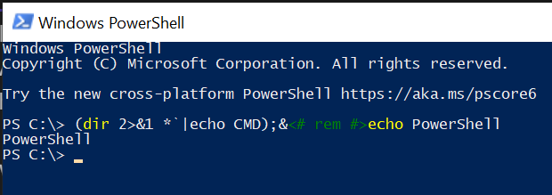 C:\Users\mac\Documents>(dir 2>&1 *`|echo CMD);&<# rem #>echo PowerShell